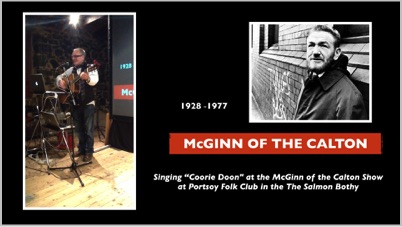McGinn of the Calton : A look at the life and times of Matt McGinn through his stories, poems and songs. Using multi media and live songs I will present an insight into the works and life of Matt McGinn. Listen to the final song "Coorie Doon” taking from my "McGinn of the Calton" show.